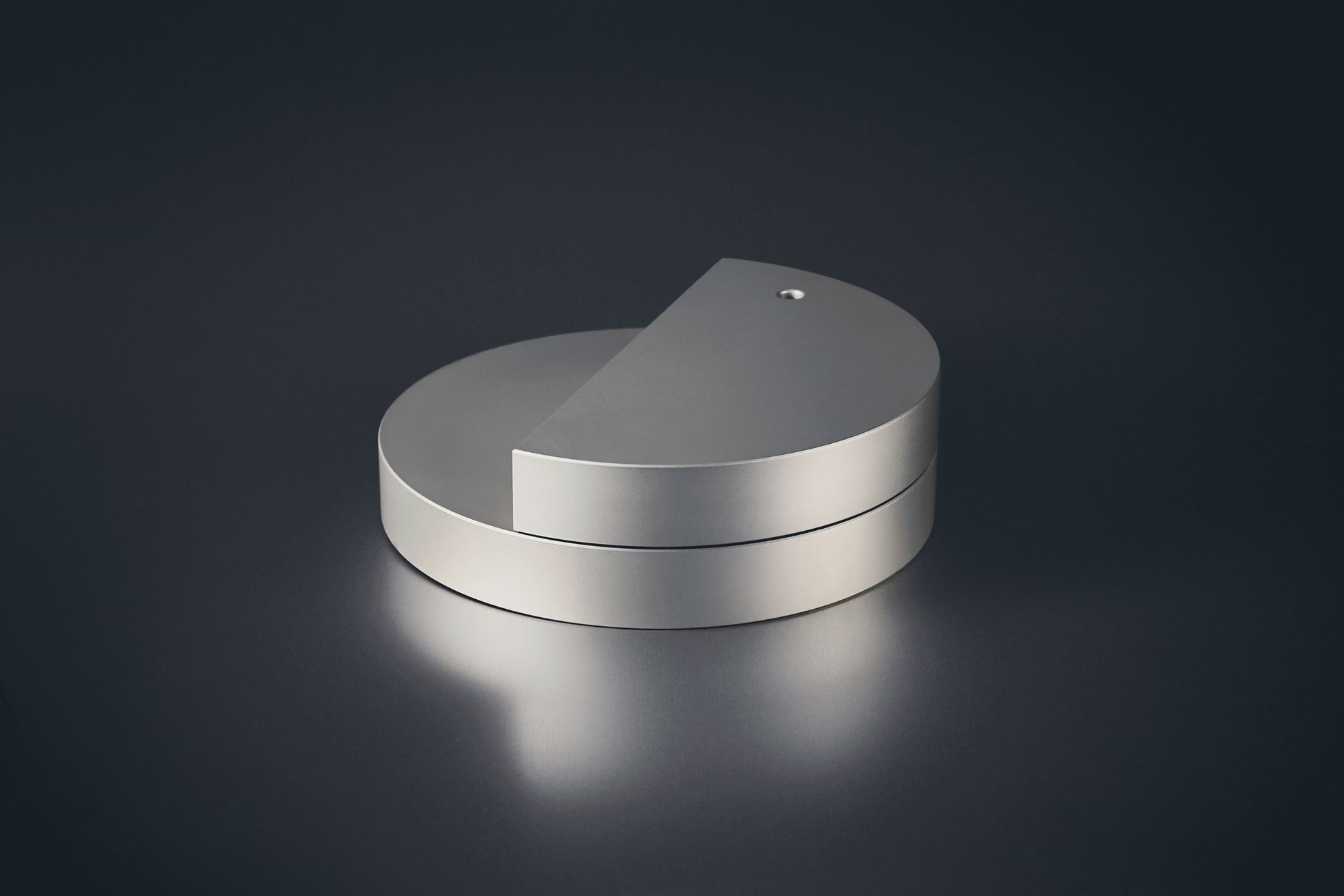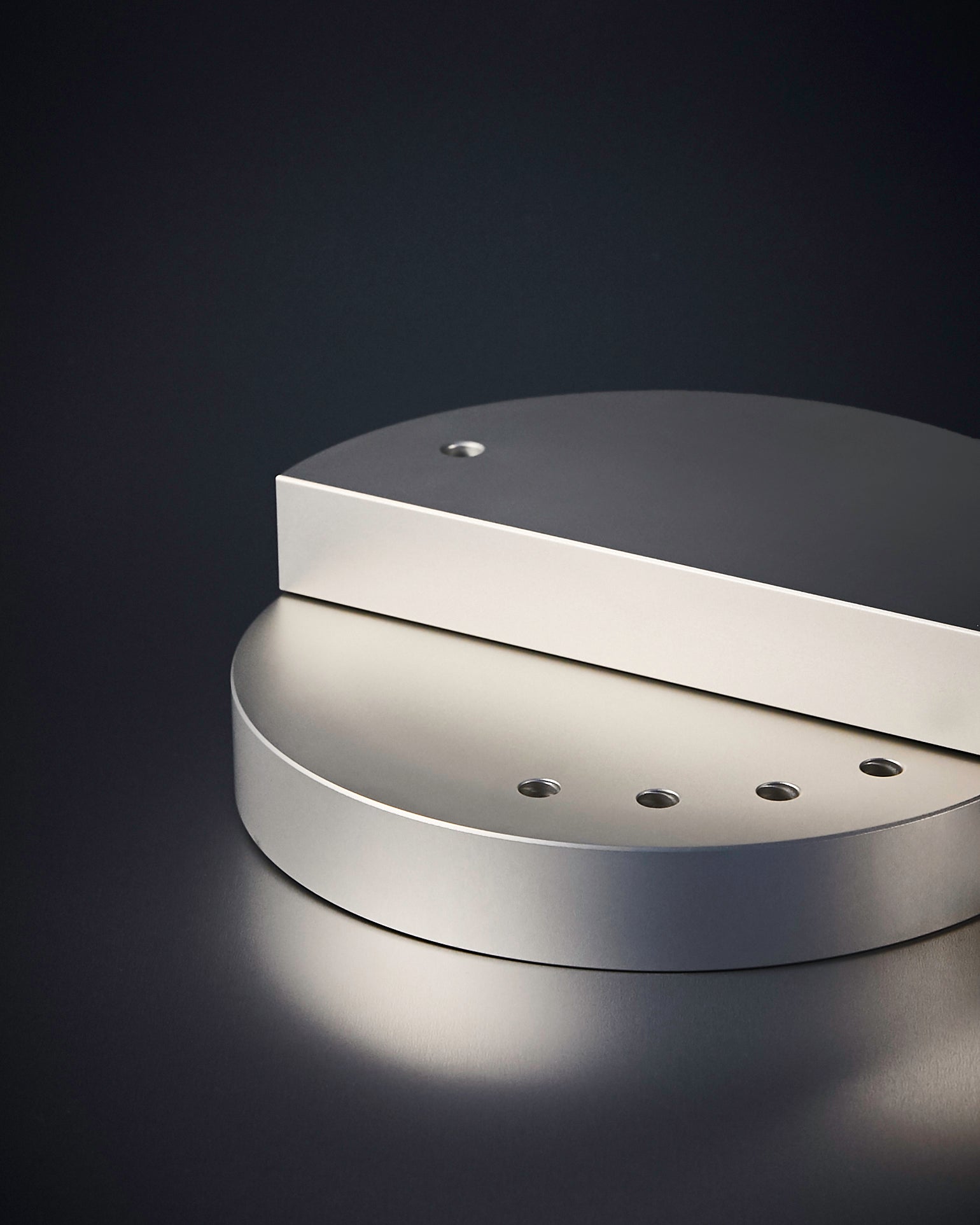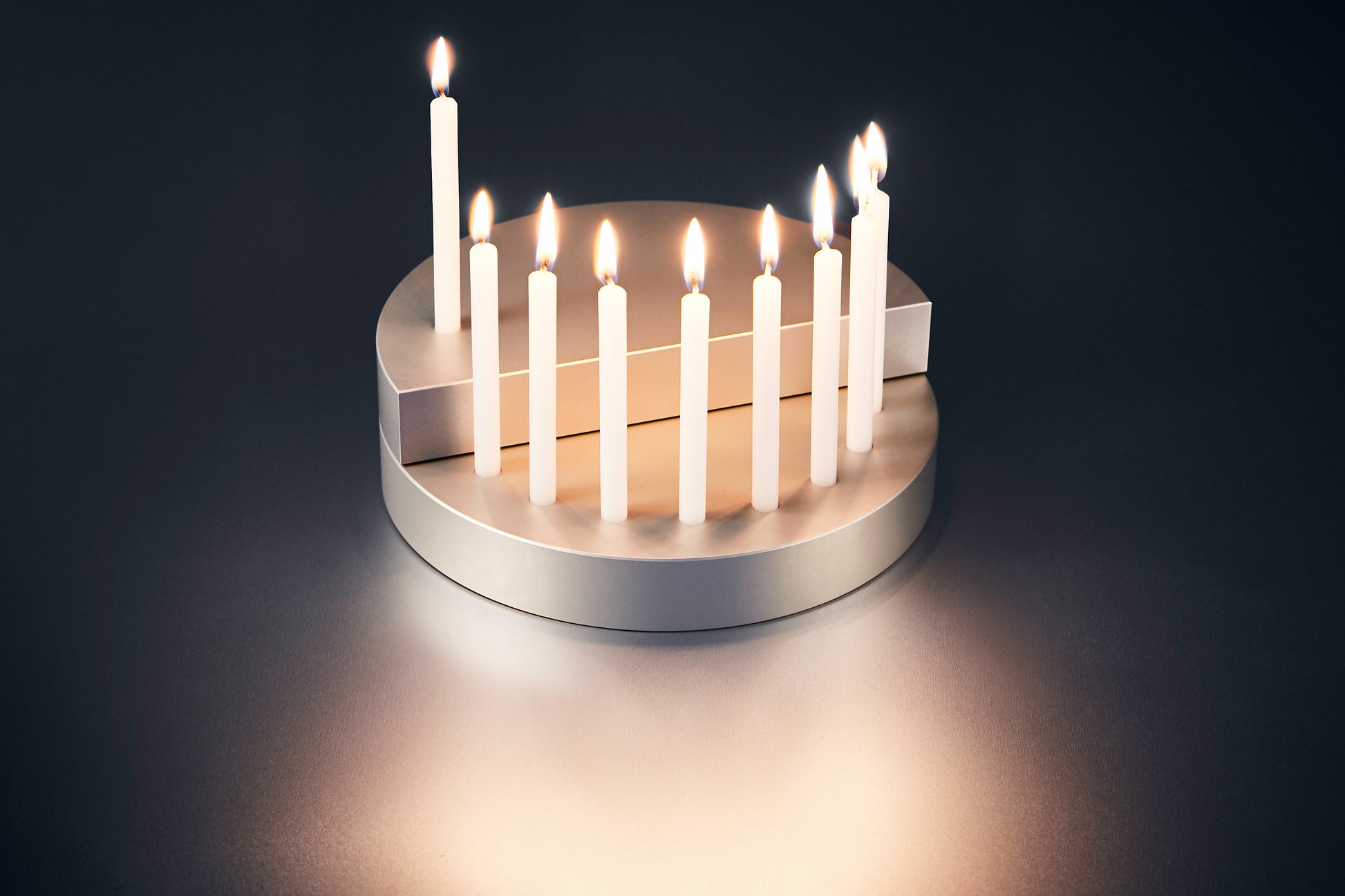 Menorah by MA-MA in sandblasted aluminum finish. This product is sold with custom non-drip candles.